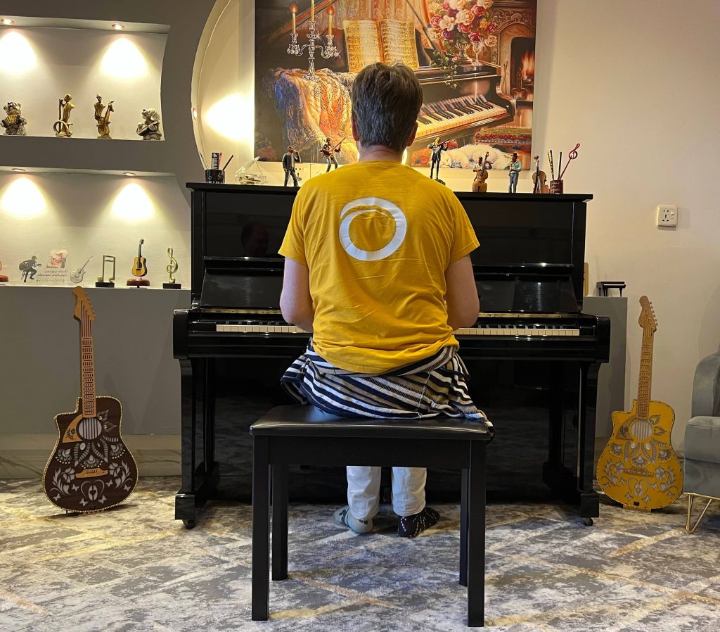 Throughout this immense human tragedy, also other, seemingly insignificant infrastructure was destroyed. Musical instruments were among the casualties, as ISIS made efforts to destroy all of them. This has made it nearly impossible to find instruments like pianos and double basses. Almost impossible… Fortunately, we were lucky to discover a piano in excellent condition at the home of a university professor who graciously agreed to lend it for the festival. So, for our trio concert, we hope to have a genuine piano at our disposal. The professor’s house is a museum of its own—a place of quiet resistance. Every detail in the house is music-related, from the ornaments on the door to the guitar-shaped lamps and the figurines of musicians, even the piano keys on the coffee cups that served us Nescafe. The professor’s sons treated us to a quatre-mains piano performance, and we engaged in meaningful discussions about how to contribute to the music scene in Mosul. It’s no easy task.